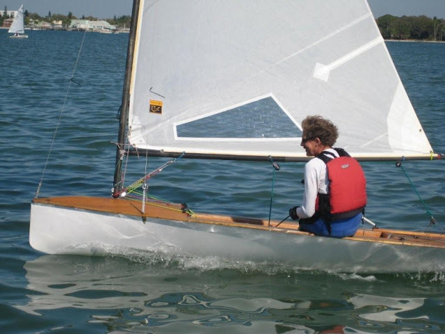 | As a final note on the Europe design I must contrast GYPSY with a stock boat. This is Walt Collins' Europe. Note that his boat has a much flatter fore deck and an unstayed mast. Walt came in second in Gen I at this regatta. |