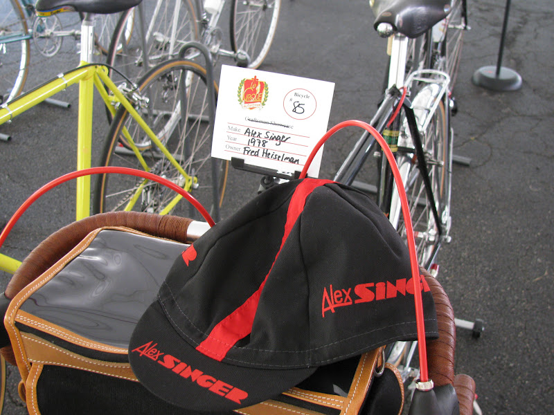Towards the end of the day the "keepers of the flame" frame builders where encouraged to gather for a group shot. I only recognize a few: right side of first row is Peter Weigle; left side of second row is Dale Brown and standing next to him is Isis Schiffer. The biciak.blogspot.com site has a similar photo with almost complete identities of the folks present.